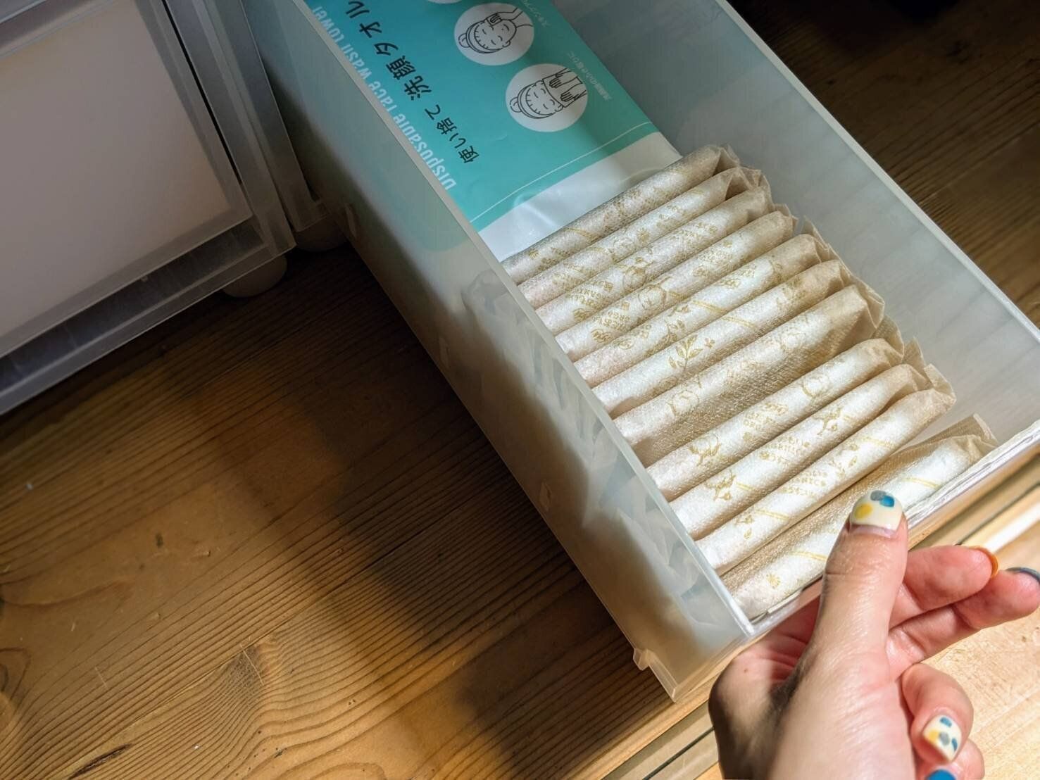 慌ただしいワンオペ中は、子どものオムツをバッチリ準備できていても、自分のナプキンは忘れがち。ということで筆者宅では、脱衣所に少量のナプキン収納スペースを設けています。たったこれだけのスペースがあるだけで、慌てることがなくなりますよ。