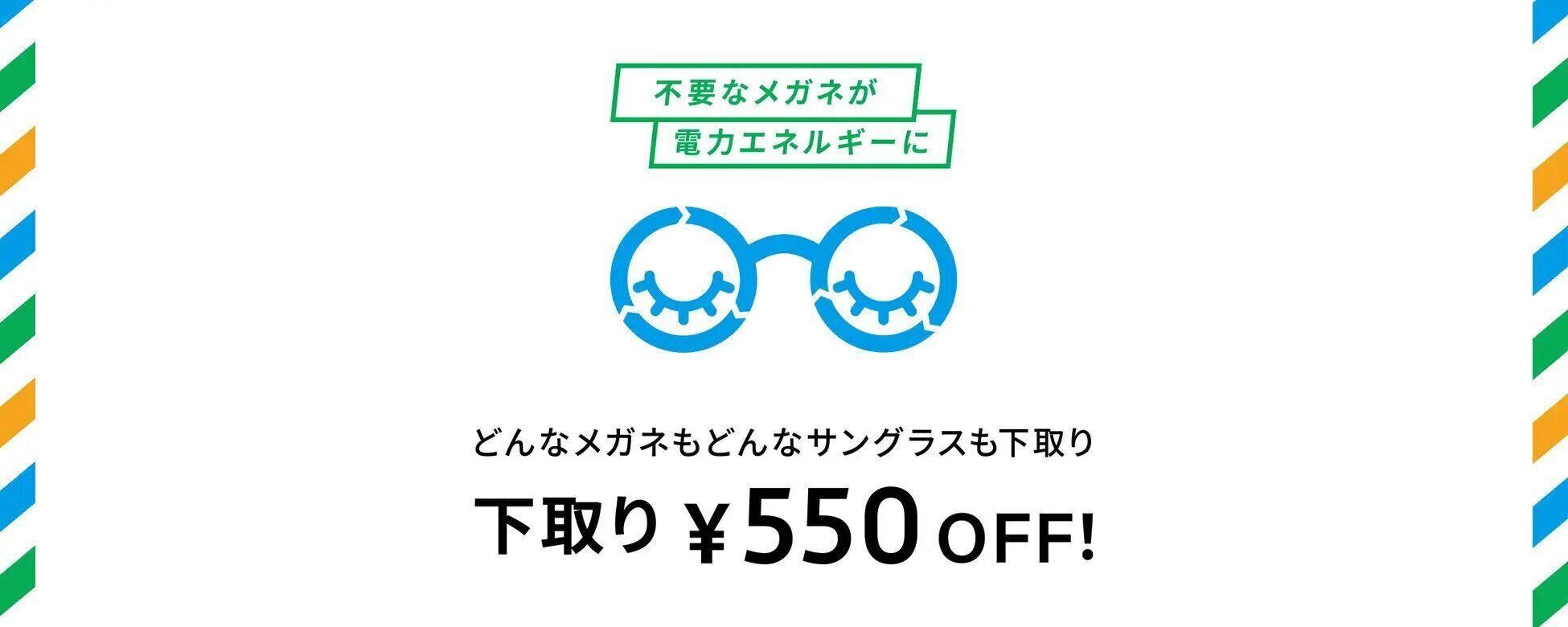 キャンペーン期間中に、¥3,300以上のメガネ(パッケージ商品含む)やサングラスを購入の際、不要になったメガネやサングラスをお持ちいただくと、会計から¥550値引きされます。