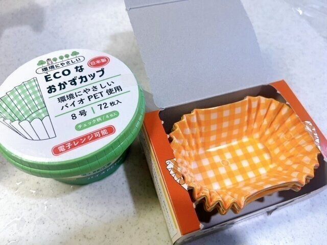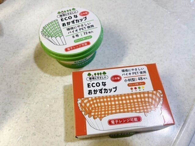 こちらです。「環境に優しいECOなおかずカップ」8号72枚入り、小判型48枚入り。