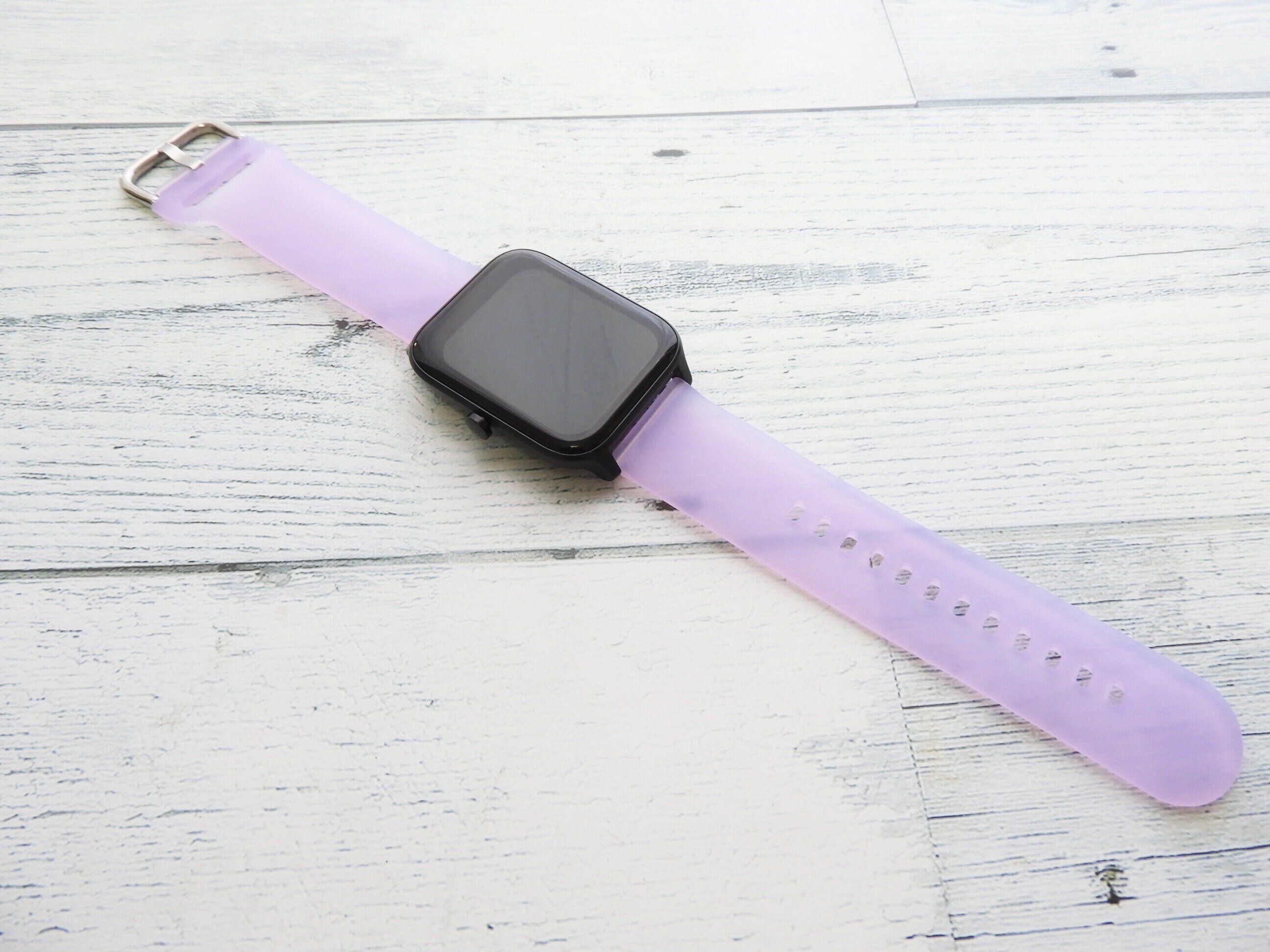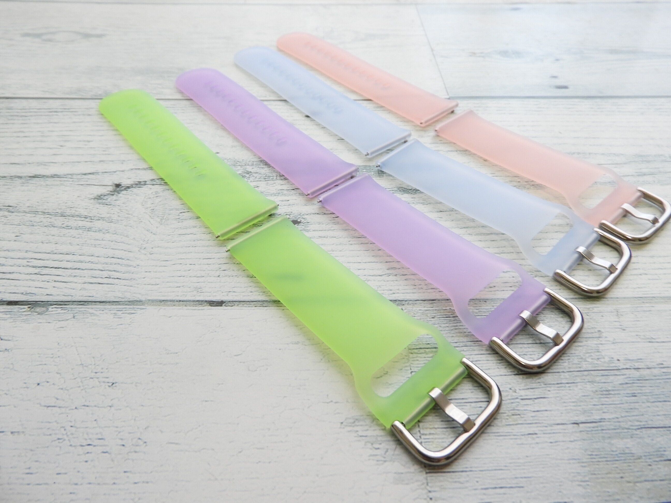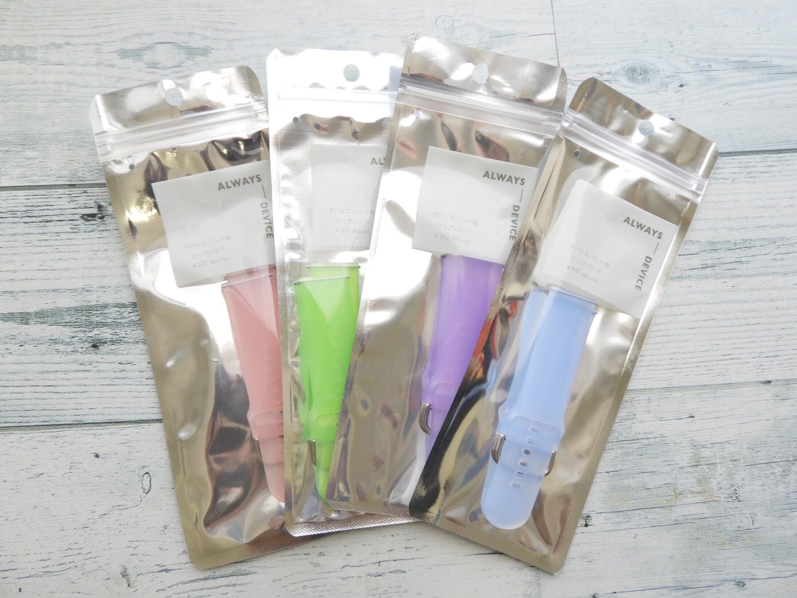 カラーはグリーン・パープル・ブルー・ピンクの全4色展開。3COINSで販売しているデバイスバンド専用アイテムです。対応機種は「2421/GHW01」「2413/GHW01」「2314/GHW01」。アラフォー世代にはどこか懐かしいクリア素材はエモい……!