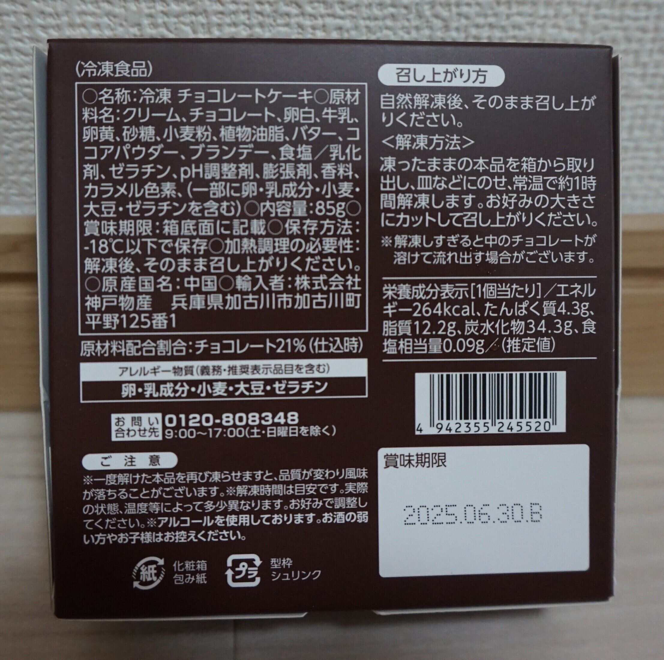 箱の裏の情報によると、カロリーは1つ264kcalとのこと。チョコレートという高カロリー食品を使っているのにも関わらず、意外とカロリーは低めなのが嬉しいですね。