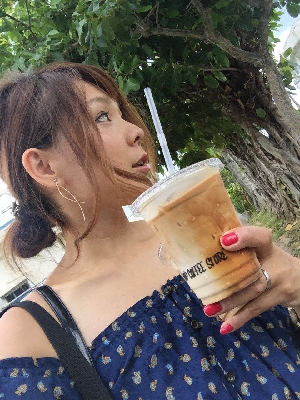 自撮りは必ずしもカメラ目線である必要はなし。あえて目線を外した写真も、モデル風で格好よく見えます。これは下からのアングルですが、手持ちのドリンクが手前に大きく映り込んでいるので、それによる小顔見せ効果も!(サンキュ!ブロガー臼井愛美さん)
