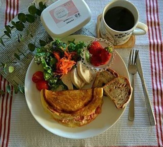 おしゃれなカフェメニューのようなワンプレートをつくる宮内有紀子さん。オムレツにはKALDIで購入したたらこスプレッドを挟んでいます♪それだけで豪華&ピンクがかわいい!パスタやサンドイッチに使えて万能!