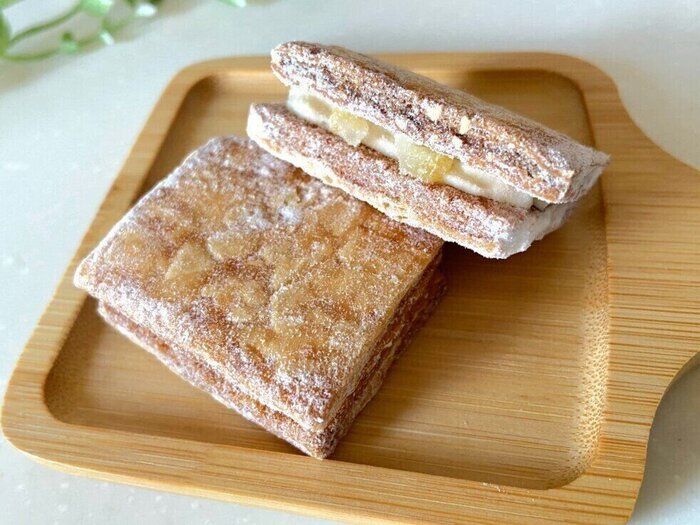 手で持ってみるとむちーっと伸びて弾力があるグミ。外側さっくり、中はもっちり、食感にやみつきになる個性的なグミです。