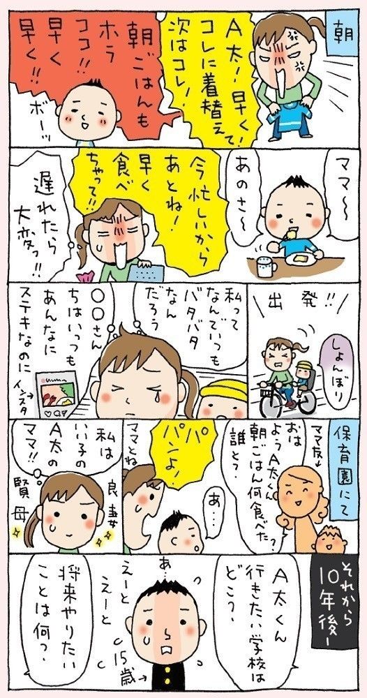 上大岡:私はまさにこの漫画どおり(笑)。早く園に連れて行かなくちゃと、「はい!服。はい!靴下。早く!」とせかしてばかりでした。でも、この年ごろの子どもって、何でも自分でやりたがるでしょう。そのくせなかなかやらないから、毎朝、イライラの連続でしたよ。