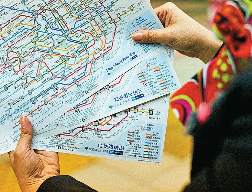 駅の改札近辺で、切符の買い方や乗り継ぎに迷う人のガイドをするのが、地下鉄コンシェルジュの主な仕事。「東京は路線が複雑でわかりづらいんです」と菊地さん。常に数カ国語の路線図を携行。担当駅は日によって変わる。観光客が多い駅だと1日300人以上案内することも。「日本に来てよかった!」と言ってもらえるようにいつも笑顔で応対したいです(菊地さん)