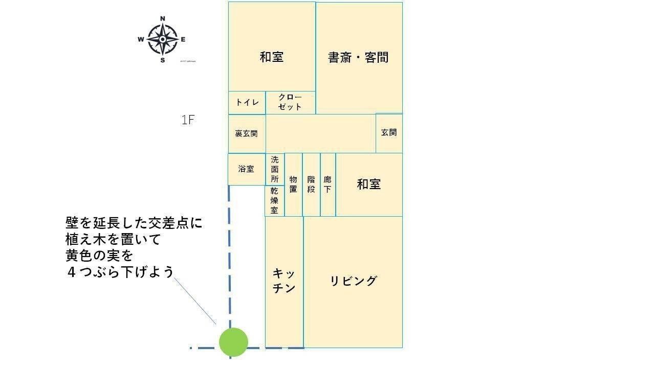 じゃ、コパが、これから欠けをカバーして、家庭運が上がる風水を教えるからね。まず、外に出て、欠けにあたる壁面をそれぞれ延長させて、延長線が交わる位置に鉢植えを置くこと。