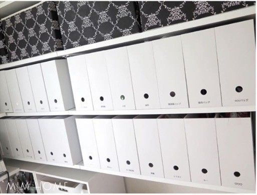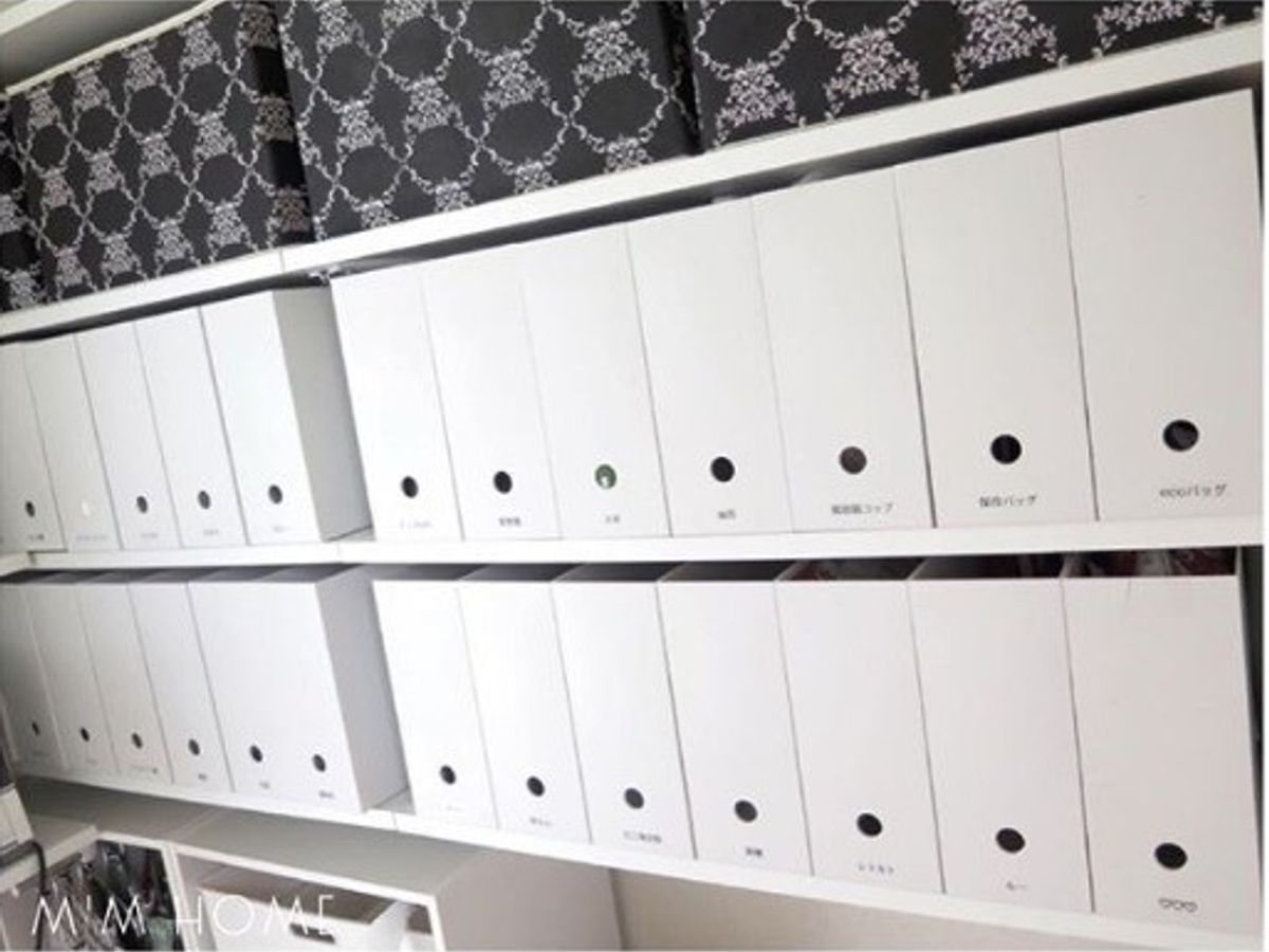 m_m_homeさんのなくてはならない収納グッズその1はファイルボックスです。パントリーにずらりと並べられたファイルボックスは統一感があって圧巻です。m_m_homeさんは気に入ったものを持って他の収納場所を探し必要な数を揃えるので、お家では同じ収納グッズがたくさん使われています。