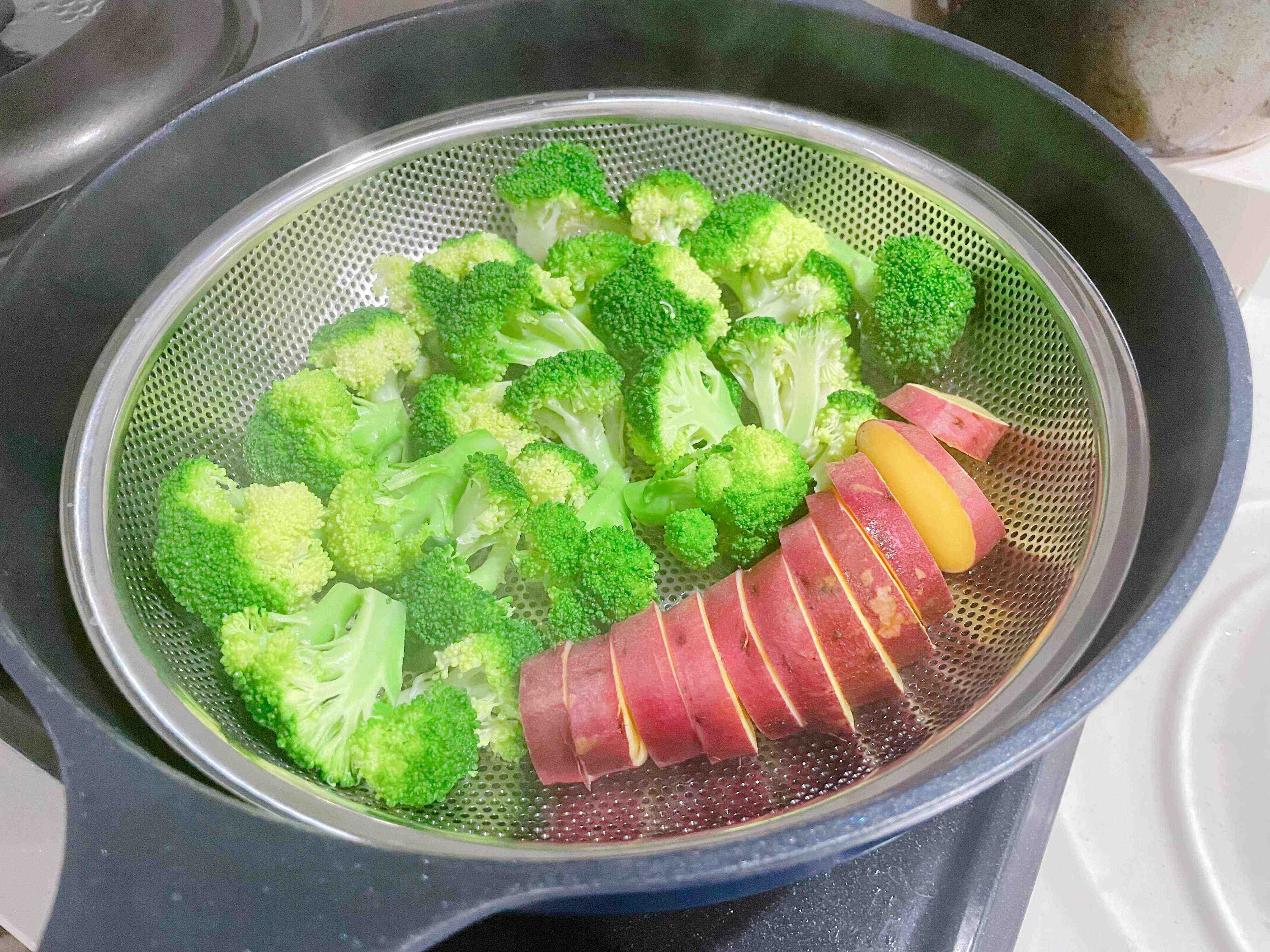 水を張った深めのフライパンにこのざるを置き、さつまいもとブロッコリーを蒸してみたところ、ほどよい火のとおりで色がとてもキレイに仕上がりました。