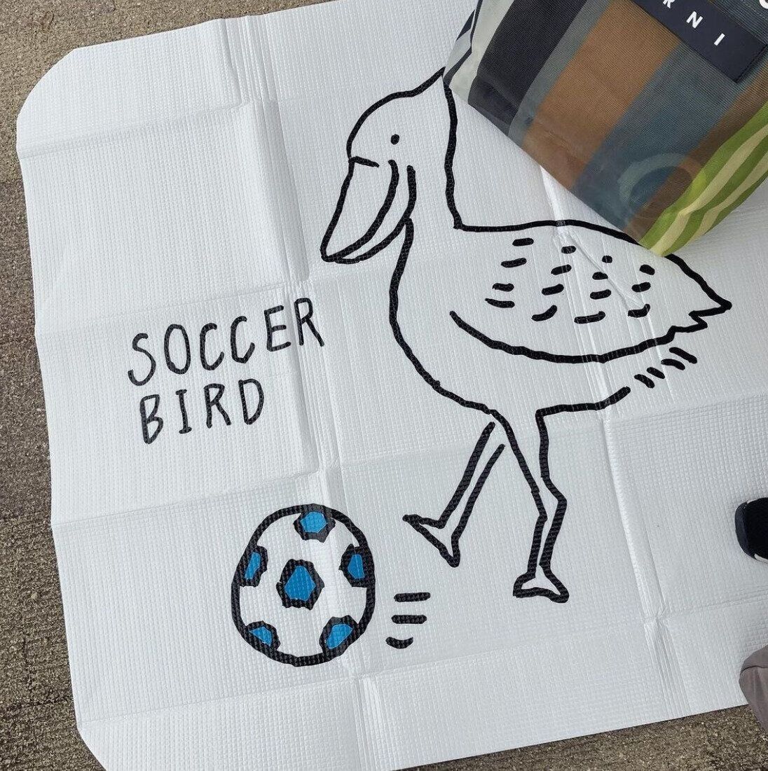 大判サイズのレジャーシートの表面は落ち着いたカラーとロゴがクール