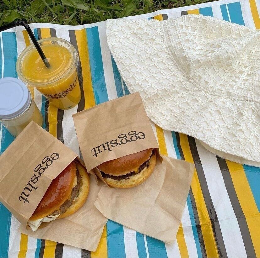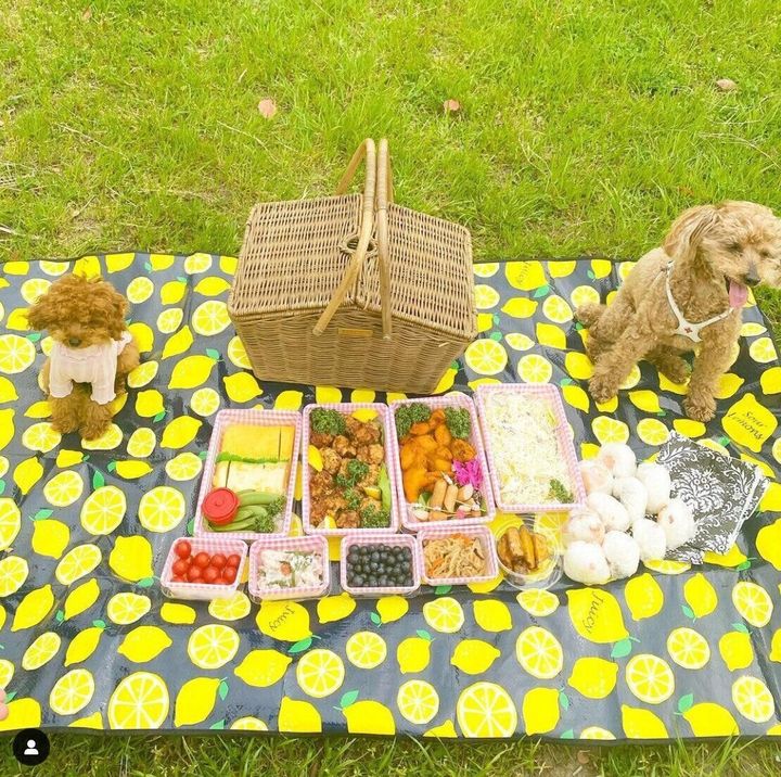 イエロー×ブラックのパキッとした配色と、いっぱいに広がるレモン柄がおしゃれなダイソーのレジャーシート。1枚敷くだけでパッと華やかになり、カゴやランチケースとの相性も◎。ピクニックが楽しくなりそうですね!