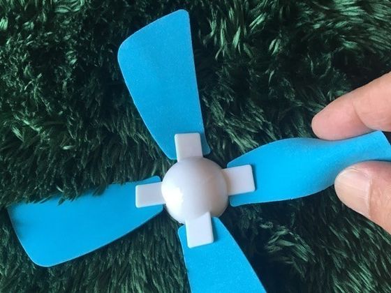 電源入れると、風車は軽快に回ります。風車は回っているのですが、風がまったく吹いてきません……あれ??? 箱に書いていた説明をよく読むと、自分で風車の角度を調整するように書いてありました。自分で風車の角度を調整できるのが、この扇風機のおもしろいところです。
