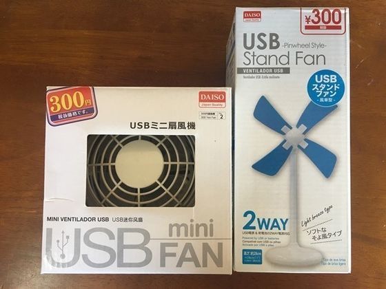 今回ダイソーで見つけたミニ扇風機は2種類。サーキュレーターのような扇風機と、風車のようなデザインが印象的な扇風機で、どちらもUSB給電で駆動するタイプです。