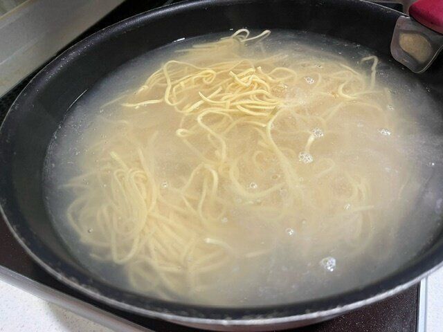 湯切りした麺を油を引いたフライパンに入れ、こんがりと焼き色がつくまで焼きます。