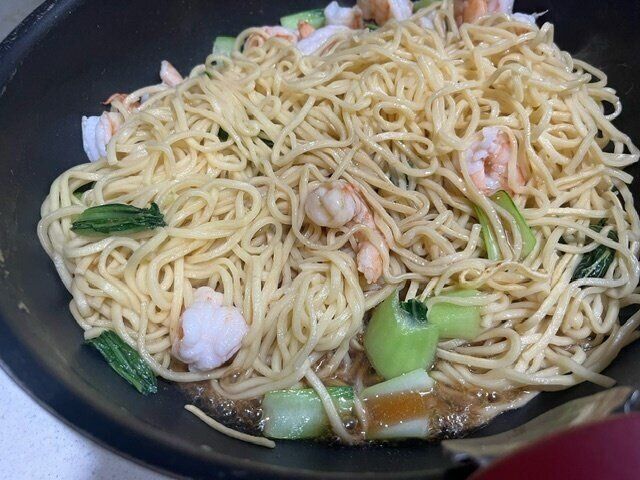 今回は海鮮焼きそばにしたかったので、海老とチンゲンサイを具材に入れてみました。