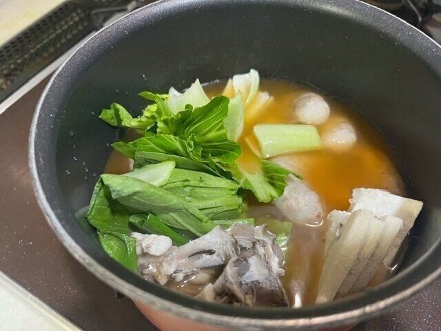 私は今回、チンゲンサイ、まいたけ、えりんぎ、海老をたっぷり入れてみました。