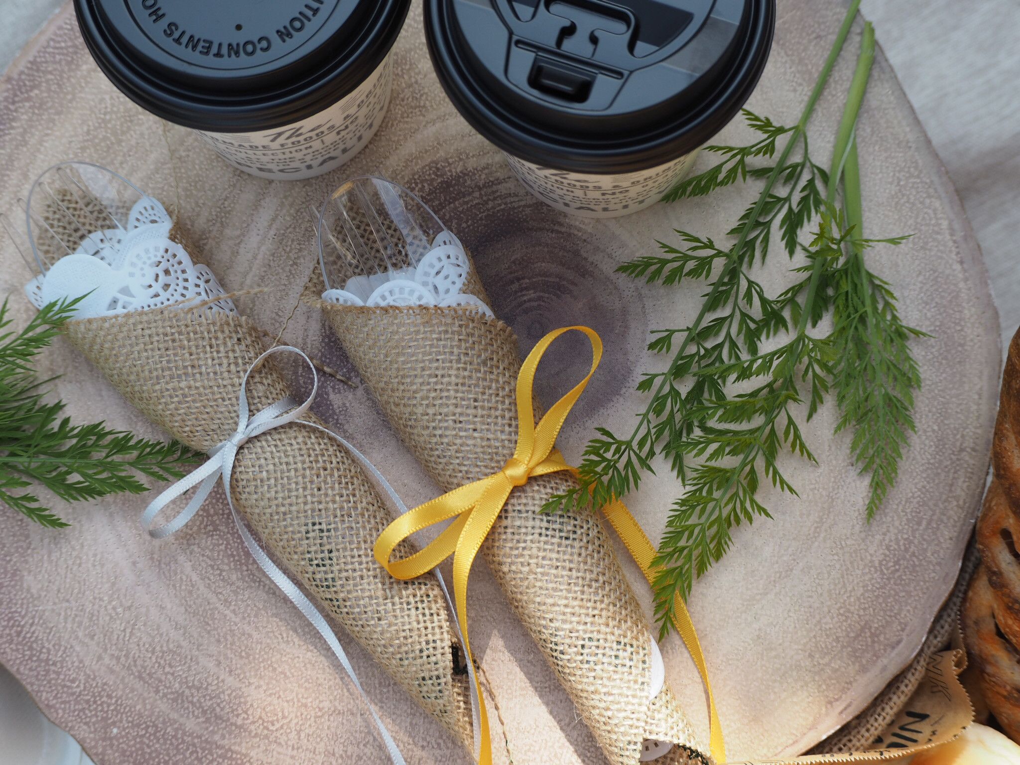 パンの入れ物をおしゃれにしたら小物にも気を使いたい!ジュートベジタブルストッカーをカットして使えば同じ素材で統一感のあるカトラリーケースの完成。内側にレースペーパーを置いてカトラリーに巻くだけなのでお手軽。余った切れ端はボックスに巻いても◎。
