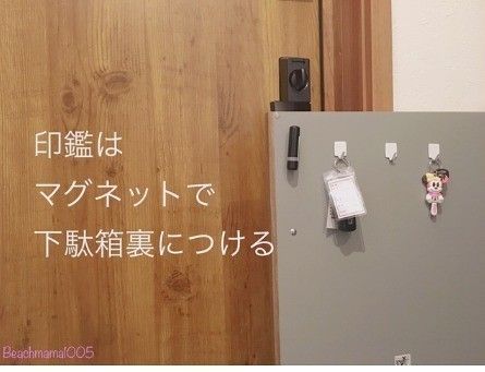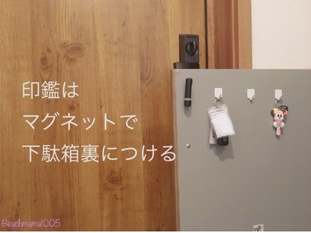 beachmama1005さんは靴箱の扉裏に印鑑を収納しています。セリアの小さなマグネットを印鑑の後ろに接着剤で貼り、扉のネジ部分にくっつけています。これなら細々している印鑑もすっきり収納することができますね。