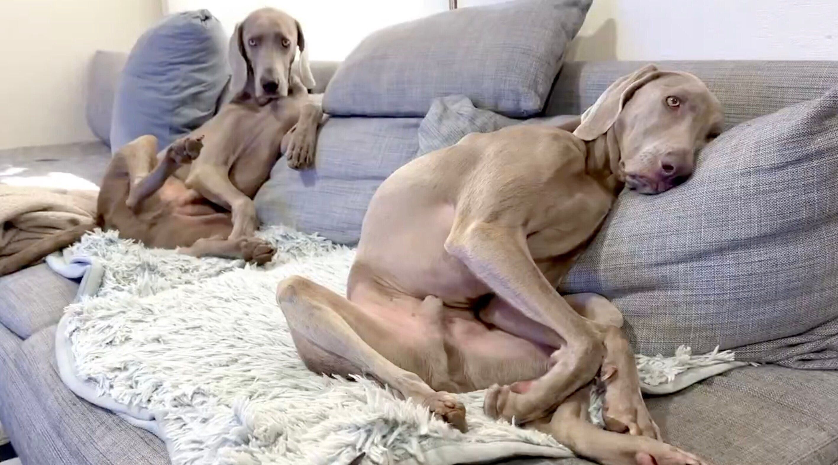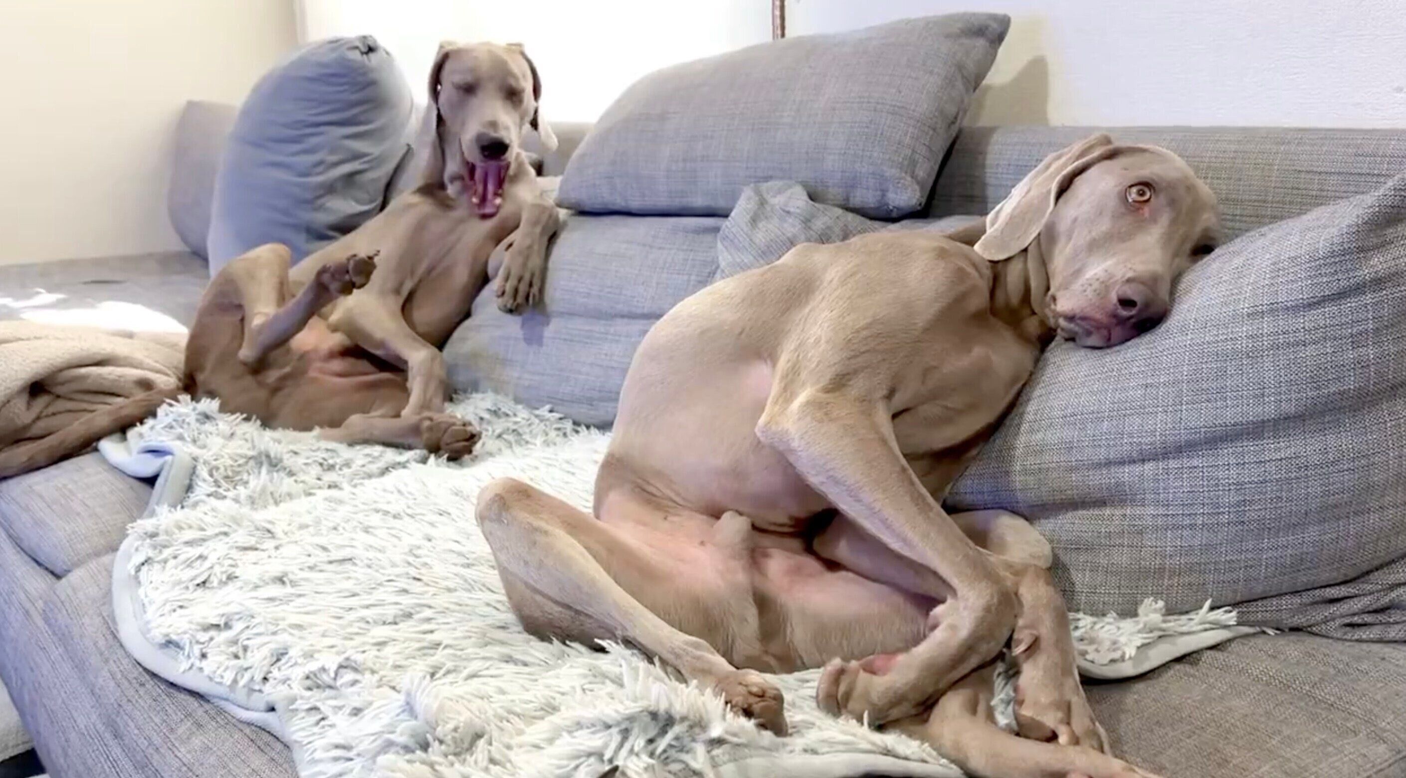 元々活発な性格のワイマラナーですが、2匹のあまりのくつろぎっぷりに飼い主さんが「犬じゃなくておじさん育てているのかも」と、不安になるのも納得ですね。