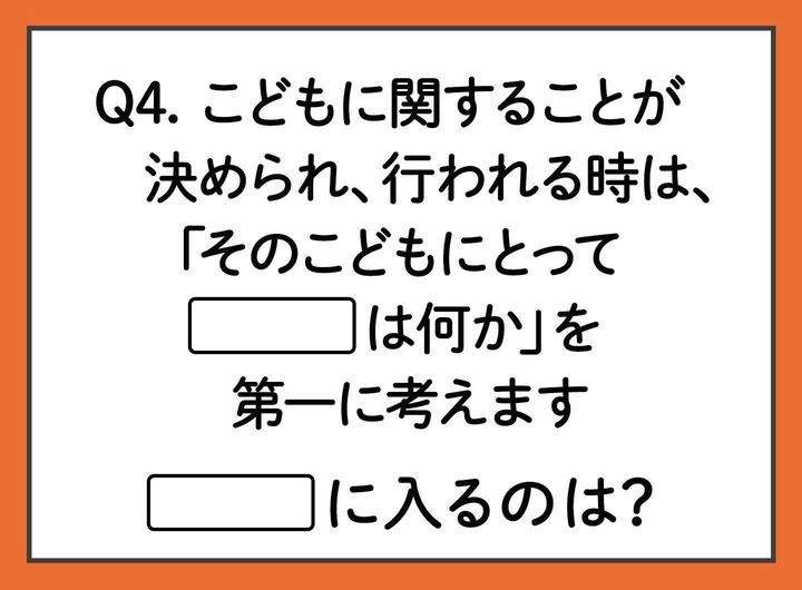 こどもに関することが決められ、行われるときは、「そのこどもにとって最もよいことは何か」を第一に考えます。