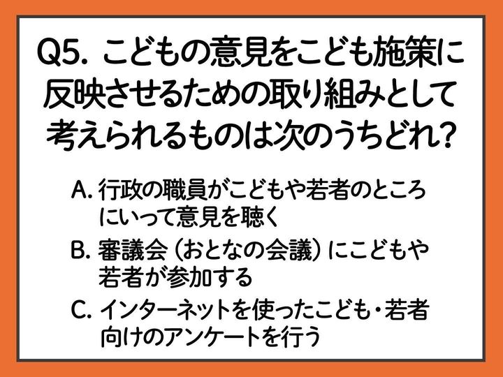 意見を聴く方法はいろいろあります。行政の職員が直接会って意見を聴いたり、おとなの会議にこどもや若者が参加できる機会を設けたり、インターネット経由でアンケートをとったりして集まった意見を大事にしながら、おとなたちは国の取り組みを話し合い、こどもにとって最もよいことは何かをよく考えながら、こども施策に取り組んでいきます。