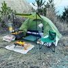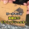 ワークマンのWEB限定で販売されている「イナレムギアシェルター1」(38,000円)。インナーテントは2人用のサイズ感となっています。カマボコ型のシェルターで、アウターテントのサイズは、約長さ360×幅264×高さ193cm。幕体をロールアップしてメッシュにすると、風とおしがよくなるので暑い時期でも安心。さらに、すべてロールアップするとタープ使いもできる一石二鳥なアイテムです。