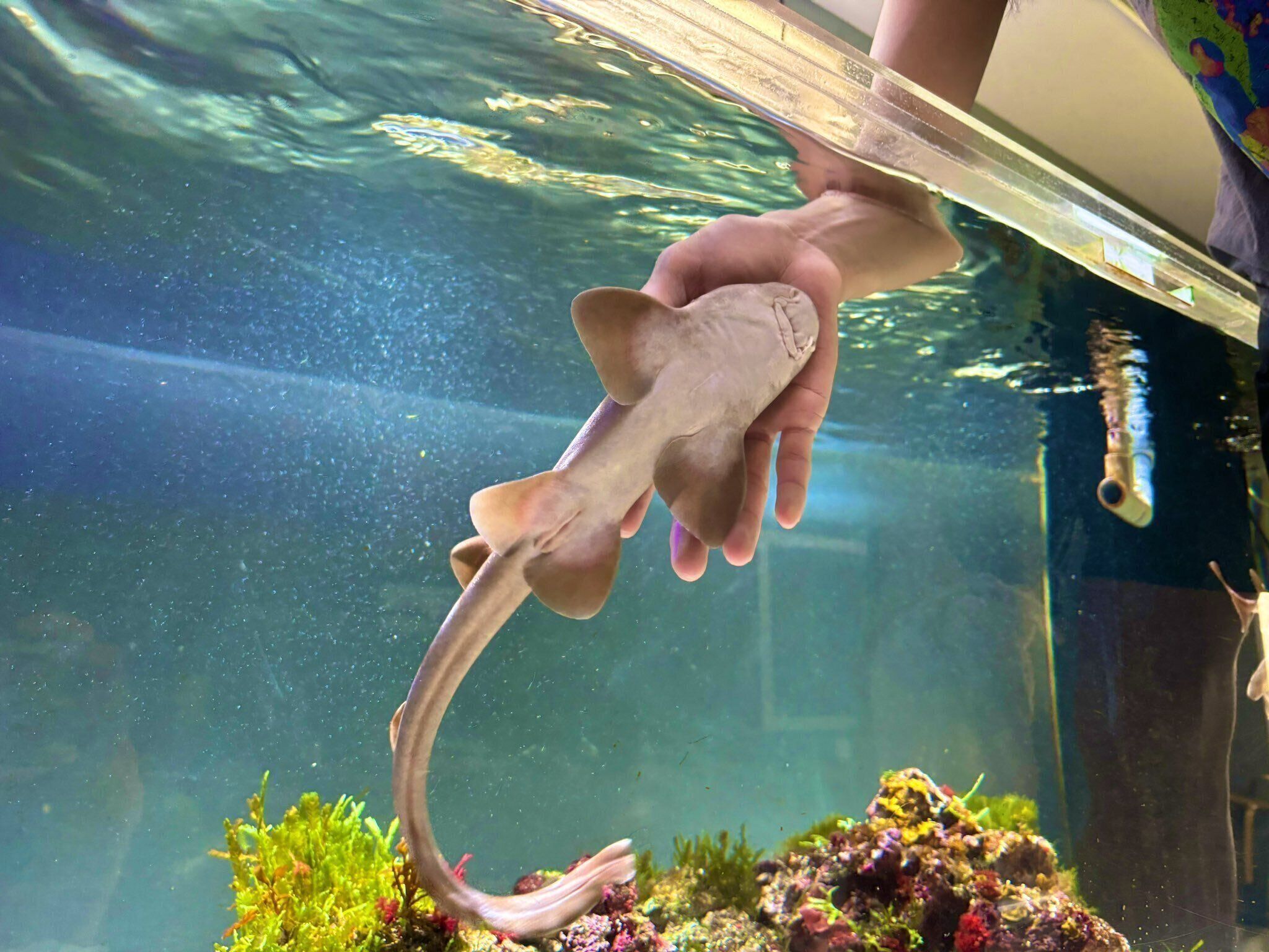 人懐っこいサメちゃんたちとの和やかなふれあいの時間。とても楽しそうでうらやましくなります。