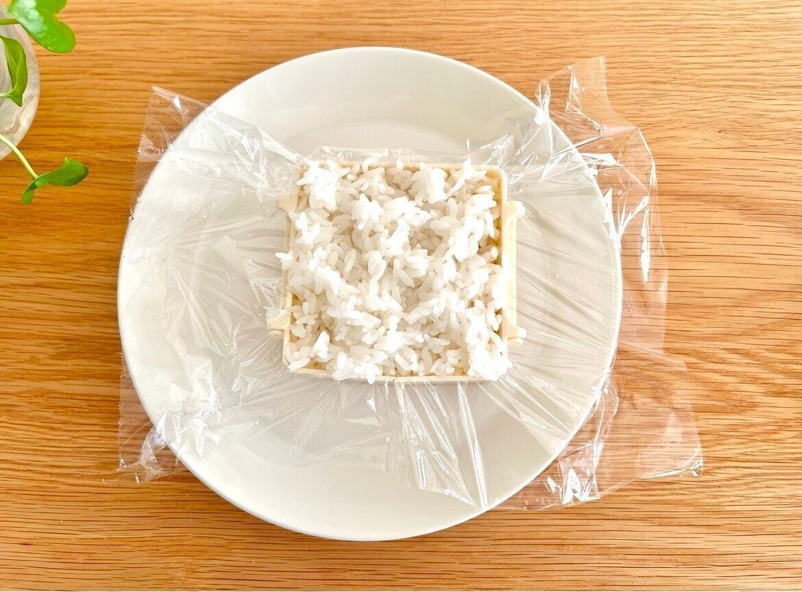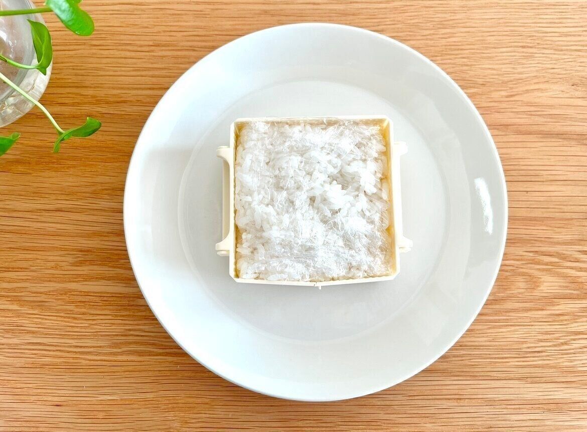 その作り方は本当に簡単!まずラップを商品に敷き、ご飯を詰めます。