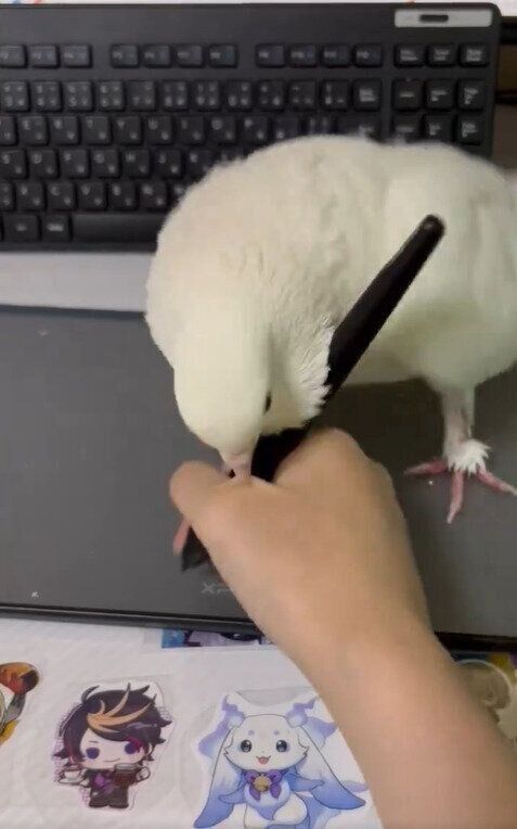 「絵は絶対に描かせないマン!」というコメントが添えられた今回の投稿。そこには、タッチペンを手に持つ飼い主さんの手と、その前に立つクジャクバト・むぎくんの姿がありました。