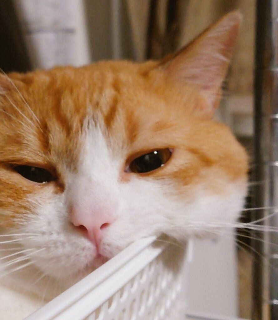 「おちゃまるはお気に入りのカゴのフチにほっぺたを引っ掛けてのんびりするのが好きなので、いつもその様子を撮影するのですが、夏と冬であからさまにほっぺのおもちの大きさが変わることに気が付きました。