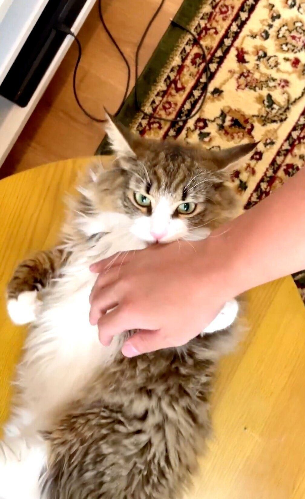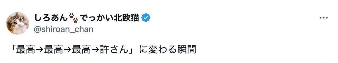 しろあんでっかい北欧猫さん(@shiroan_chan)がXに投稿したのは、愛猫のしろあんちゃんをなでているときの動画。「最高」の表情から一変、「許さん」の表情をするしろあんちゃんに、「ネコなのに豹変」といった声が集まり、話題になりました。