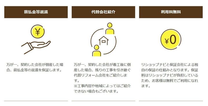 独自の厳しい審査をクリアしたリフォーム会社が加盟していますが、倒産してしまう可能性はゼロではありません。万が一倒産してしまったときに備えて、リショップナビでは、前払金の返還や代替リフォーム会社のご紹介などが可能な、「リショップナビ安心保証」という、独自の保証があります。