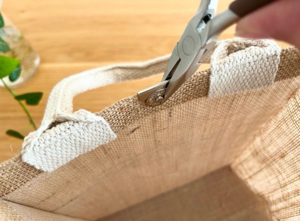 取りつけ方は、クリップのようになっているので、金具の奥まで生地をはさみ込んで、あとはペンチなどではさんでしっかり固定するだけでOK!このとき金具が変形しないよう均等に閉じ、ツメが生地にくい込むように固定するのがポイントです。