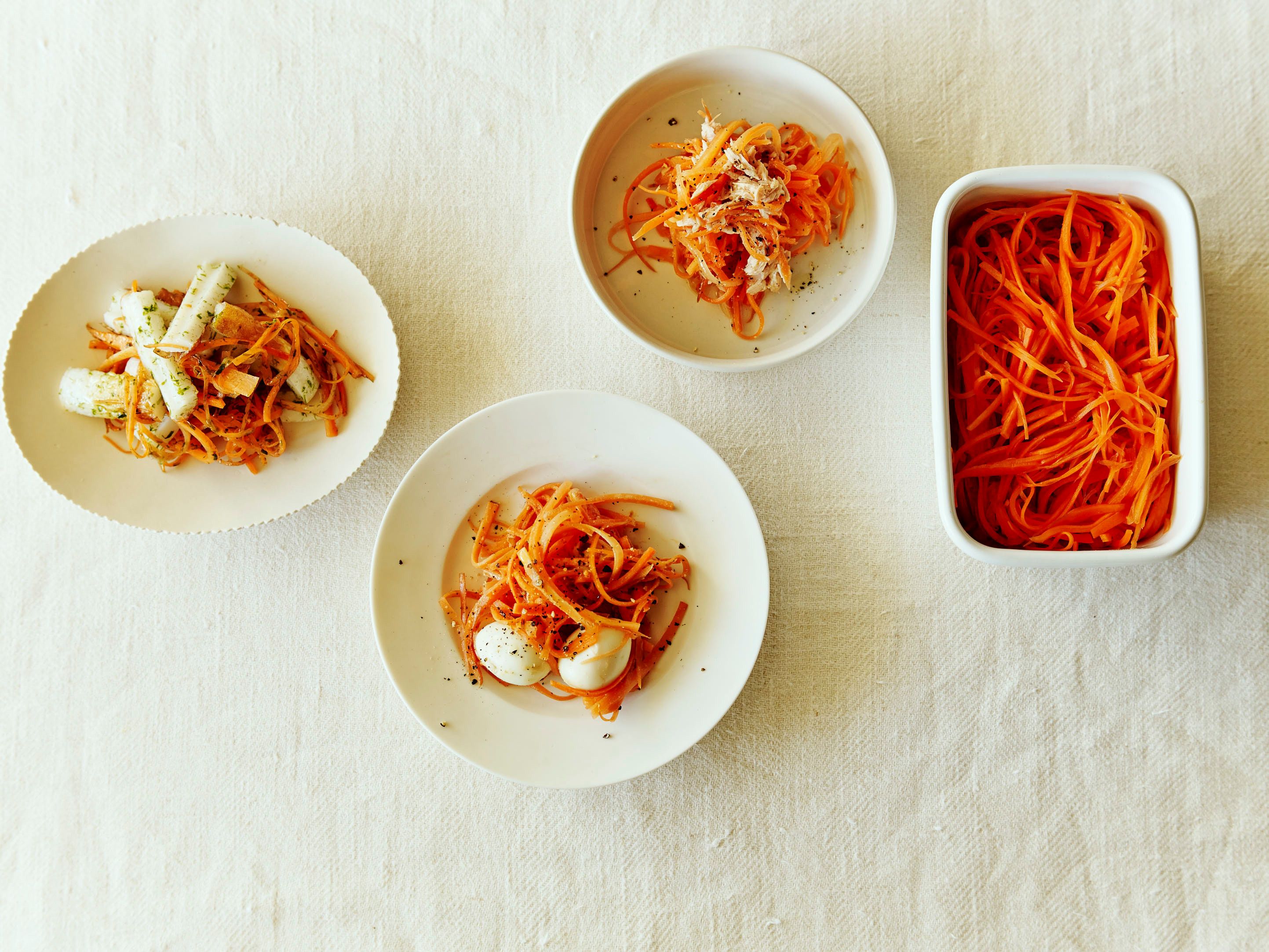 忙しいのに、一体どうやって??? そんな疑問に対し、教えてくれたのが「野菜のシンプルな作り置き」。中でもおすすめなのが「にんじんの塩もみ」。にんじんをせん切りにして塩もみするだけというごくシンプルな作り方ながら、毎日のおべんとう作りにとっても重宝しているのだそう。「そのまま詰めてもいいし、アレンジも簡単。塩もみしてあるから、他の味や材料とよくなじんで、たちまち一品できちゃいます」(ワタナベさん)。