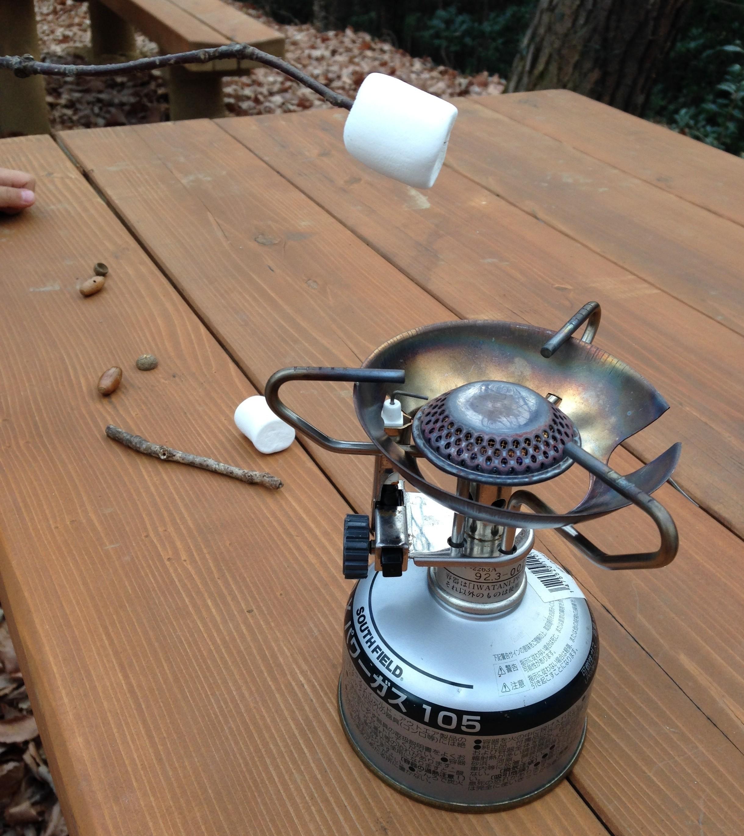 また、アウトドア用の小さなバーナーがあると、温かい飲み物や食べ物を用意できるから便利です。私はよく、子どもといっしょにマシュマロを焼いたり、小さなおにぎりを焼いたり、おべんとうのおかずを温めたりします。