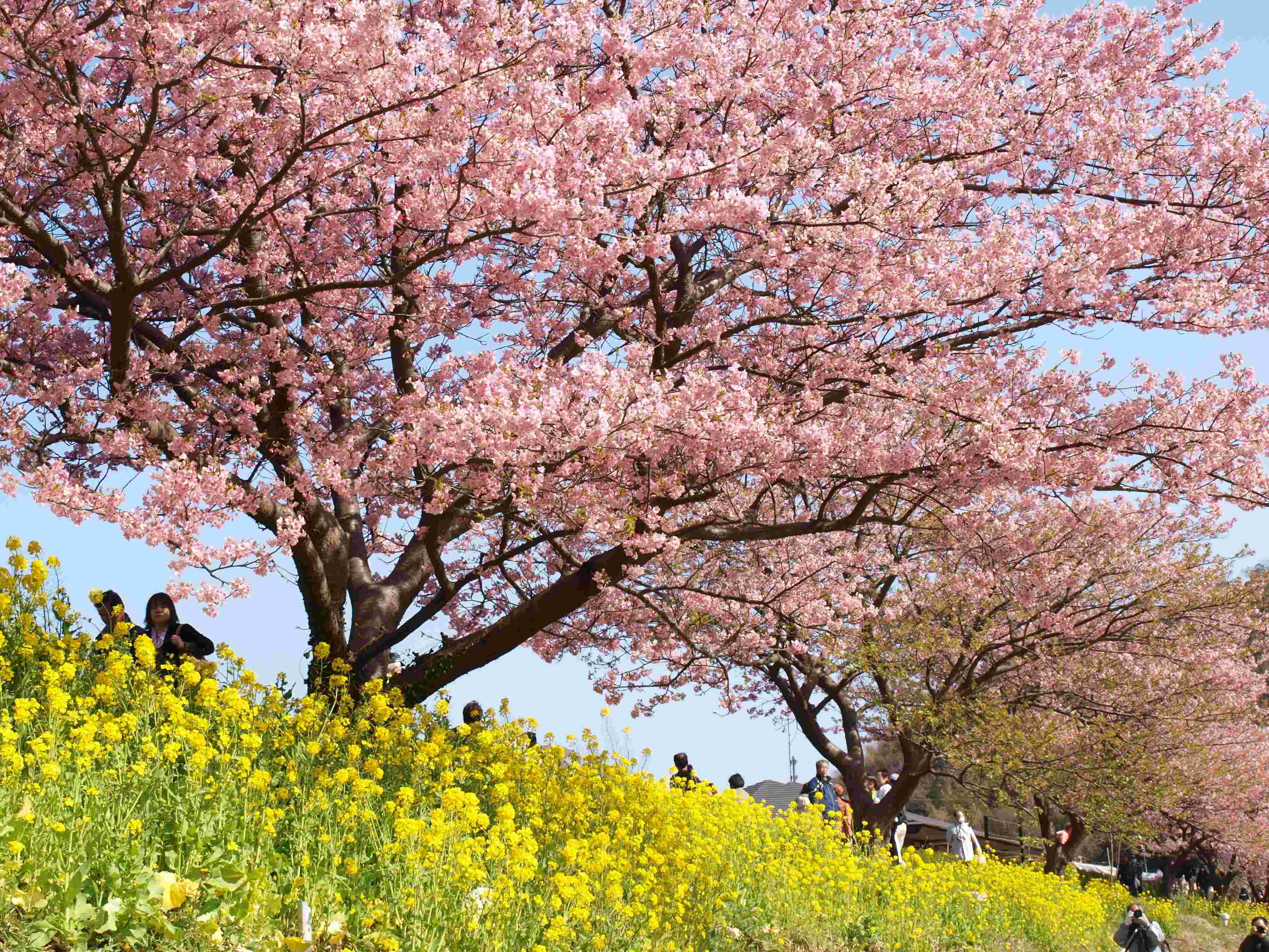 早咲きの桜で有名な南伊豆の河津周辺では、桜並木が続く川沿いの遊歩道を歩いて楽しむ人が全国から訪れます。コースの途中に、温泉を利用した足湯広場があるので、散策を十分に楽しんだら、足湯に浸かって疲れた足を癒しながら桜を眺めることができます。