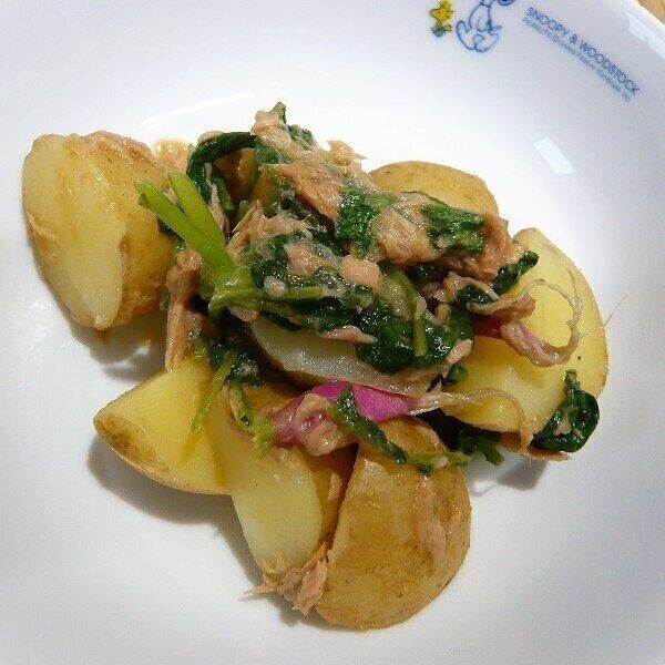 これからの季節にぴったりの新じゃがを使ったレシピです。ラディッシュを葉まで使い、じゃがいもとツナと一緒に炒め、醤油とマーガリンで味つけしました。お子さんやラディッシュが苦手なかたでも食べやすい一皿です。