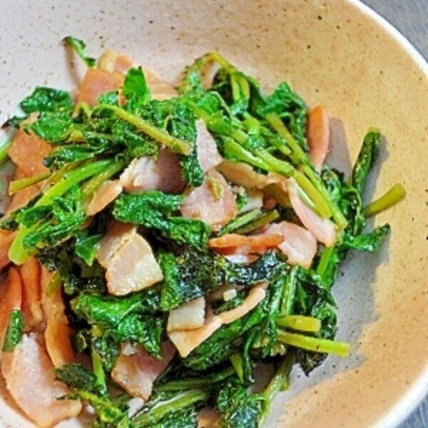 捨ててしまいがちなラディッシュの葉を活用したレシピです。塩コショウ、醤油のシンプルな味つけですが、お箸が止まらないおいしさ!ベーコンにも塩気があるので、塩コショウは少しずつ調整してくださいね。
