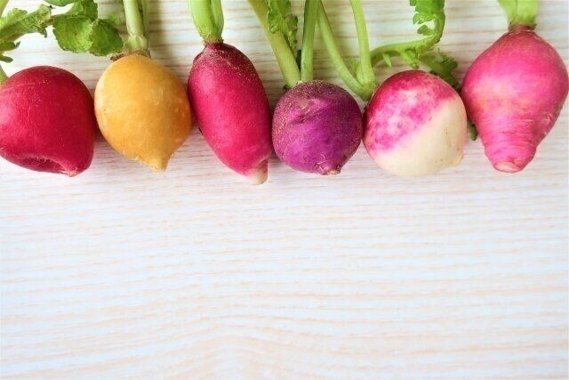 ラディッシュは種をまいてから20日ほどで収穫できることから、「二十日大根(ハツカダイコン)」とも呼ばれています。見た目は小さなカブのようですが、大根の仲間になります。前述のとおり短期間で収穫でき、育てやすくコンパクトなので、プランターを使ったベランダ栽培なども楽しめます。皮の色は赤が多いですが、赤以外にもピンク、白、黄色、紫色などの色があり、形も丸や長丸形など品種はさまざまです。