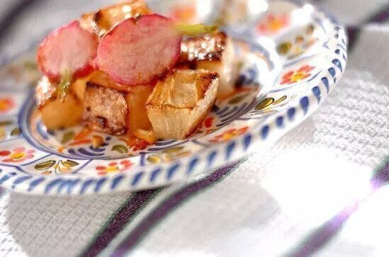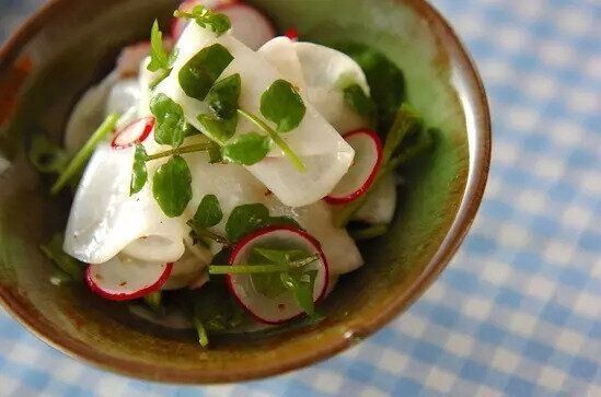 カブとラディッシュをスライサーで薄切りにし、粒マスタードの入ったマリネ液で和えたレシピです。仕上げにクレソンも混ぜて、お口直しにもピッタリなさっぱりする一品です。夏は冷やしてもおいしく食べられます。