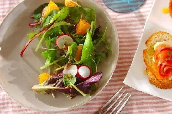 彩りもきれいでオシャレなサラダです。ホームパーティやおもてなしにもピッタリ!このサラダがあるだけで食卓が華やかになりますね。粒マスードと黒コショウのドレッシングが野菜とオレンジを上手くまとめてくれます。