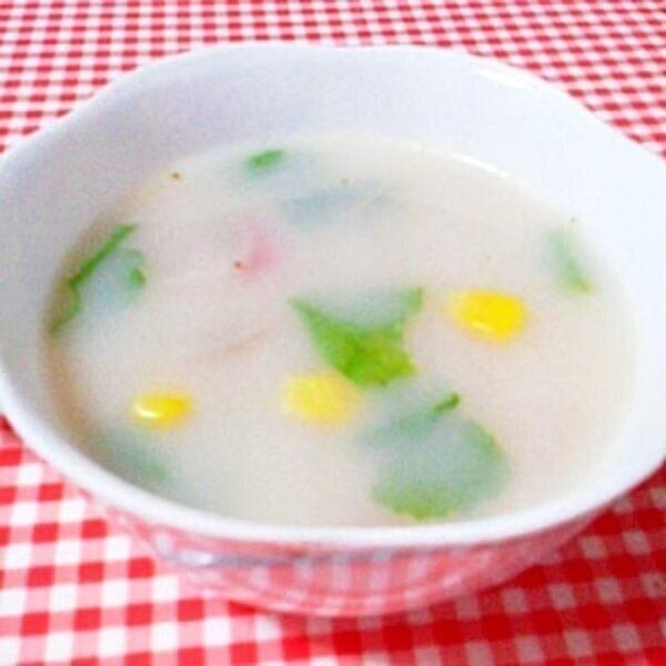 ラディッシュを子どもも食べやすいコンソメ味のミルクスープにしました。優しい甘さで朝ごはんにもいいですね。コーンとラディッシュの葉を入れて彩りも鮮やかな一品です。牛乳を入れたあとは沸騰させないように加熱してくださいね。