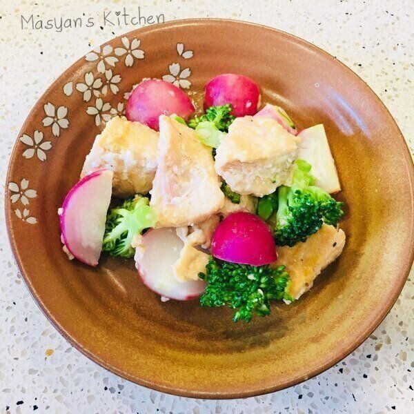ラディッシュ、ブロッコリー、鮭を炒めて、粉チーズと醤油で味つけしました。鮭は小麦粉をまぶしてから焼くことで、パサつかず味も染みやすくなります。ラディッシュは生だと苦味がありますが、しっかり火を通すと和らいで食べやすくなります。