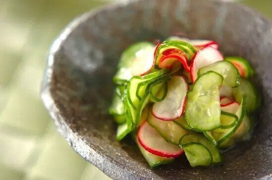 ラディッシュの赤とキュウリの緑のコントラストが美しい酢の物です。丸い形も揃っていてかわいらしいですね。生姜の搾り汁も加えて、さっぱりとした食べやすいレシピです。ラディッシュとキュウリは調味料を加える前に塩揉みしておくのがおいしく作るポイントです。