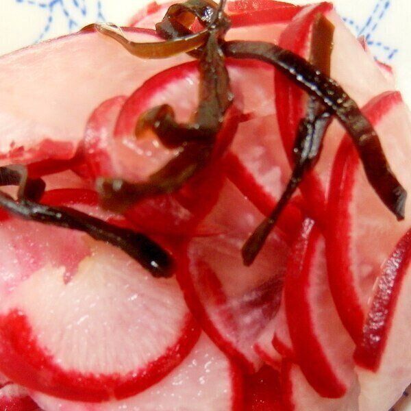 お出汁のきいた調味料に大根、ワカメとラディッシュを漬けたレシピです。いつもの酢の物も、ラディッシュを入れるだけで彩がよく、華やかになりますね。箸休めとしてもオススメです。