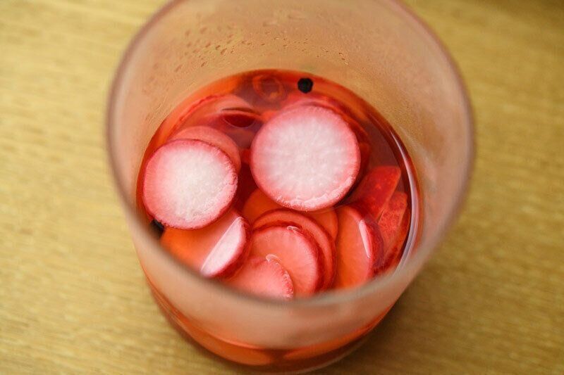 他の野菜でピクルスを作る際は昆布出汁等を使うことが多いですが、ラディッシュは出汁不要でおいしく漬けられます。お好みで唐辛子や黒胡椒を入れると、味に深みが出るのでオススメです。