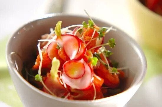 ラディッシュの葉も、身も、まるごとおいしくいただけるサラダ。好きな野菜でアレンジできるのもうれしいですね。他の食材とラディッシュとの色合いが楽しめるレシピも多いので、なんとなく食卓が寂しいときにもオススメです。