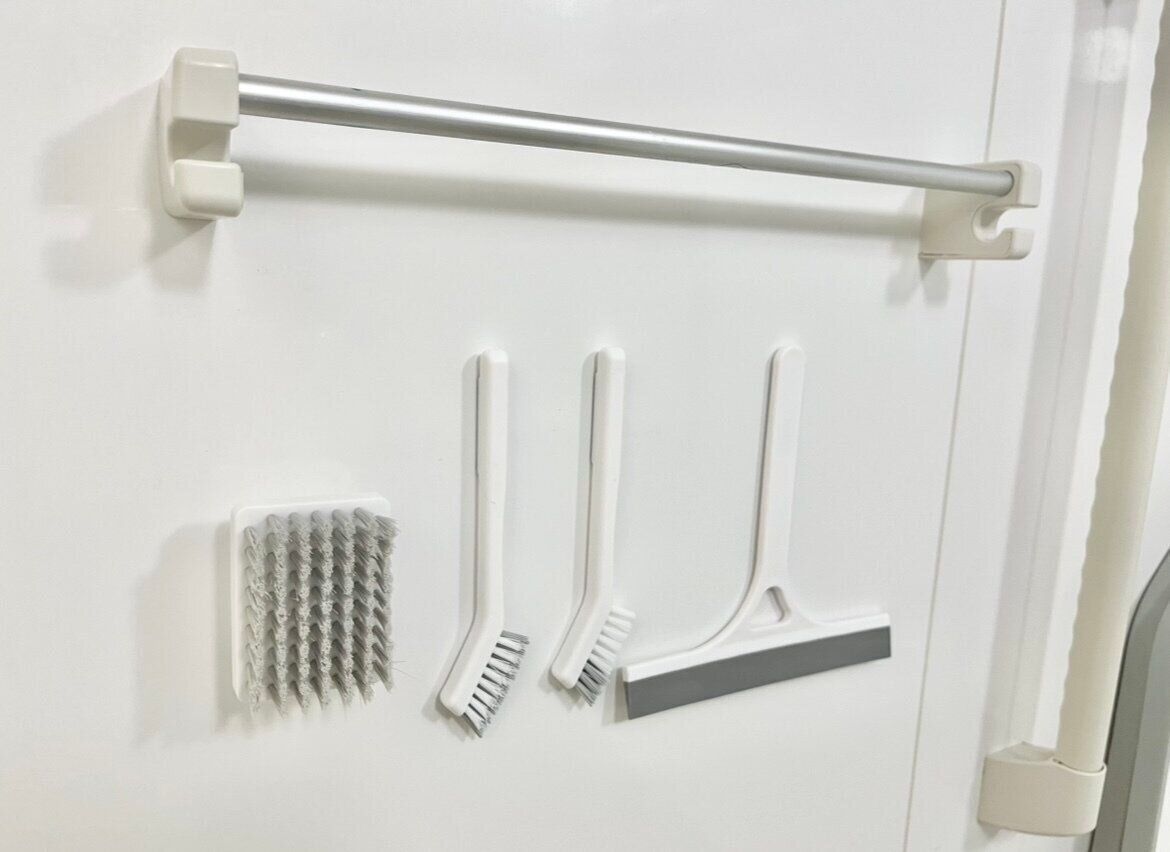どの商品も磁石で浴室の壁に引っ付けることができるので、浮かせてスッキリと収納することができます。また浮かせて収納することで、お掃除グッズ自体の水切れが良くなるので衛生的に収納することができます。特にスクエアブラシはブラシ部分が壁につかないので、乾かしやすいのも好印象!