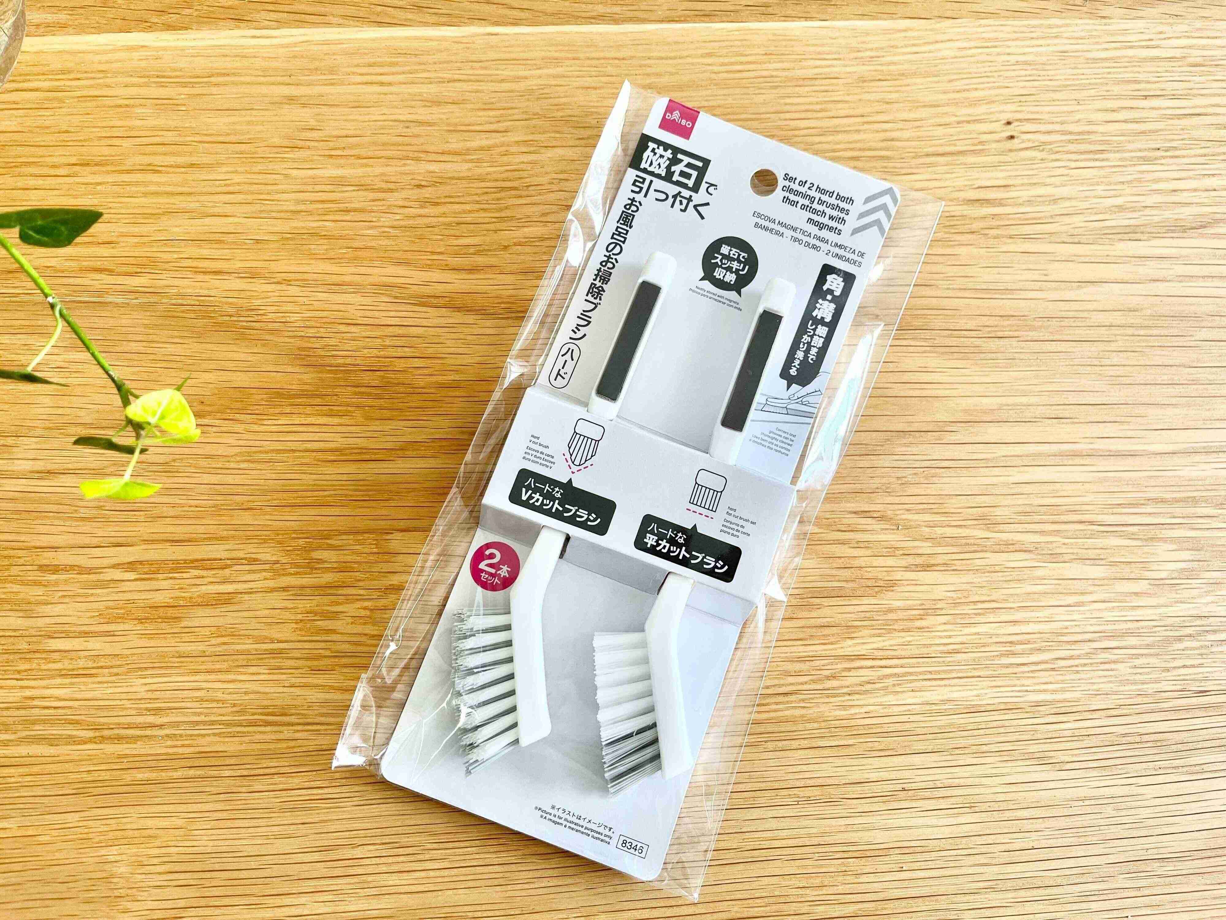 最初にご紹介するのは、「磁石で引っ付くお風呂のお掃除ブラシ(ハード、2本)」という商品。2本セットで110円で販売されています。
