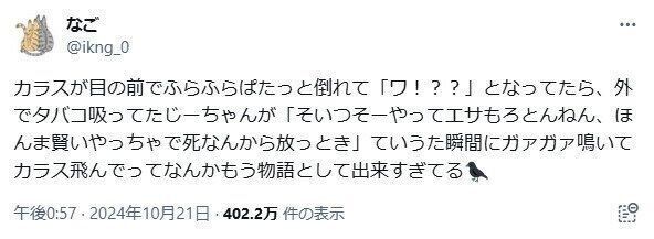 なごさんの驚きぶりから、カラスの演技がどれだけ本格的だったのかが伝わってきます。ちなみに、もし「タバコ吸ってたじーちゃん」がいなかった場合、なごさんはどのような対応をしていたと思いますか。
